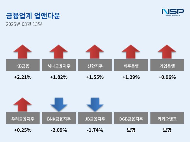 (서울=NSP통신) 강수인 기자 = 13일 코스피(-0.57%)와 코스닥(-0.92%)은 모두 하락했다. 이 가운데 은행주는 전거래일 대비 1.21% 상승했다. 은행주는 11종목 가운데 7종목이 상승, 2종목이 하락했다. 보합세는 2종목이다.