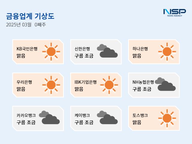 (서울=NSP통신) 강수인 기자 = 2025년 3월 3주차 금융업계기상도는 KB국민은행·하나은행·우리은행·IBK기업은행·토스뱅크의 ‘맑음’, 신한은행·NH농협은행·카카오뱅크·케이뱅크의 ‘구름조금’으로 기록됐다.