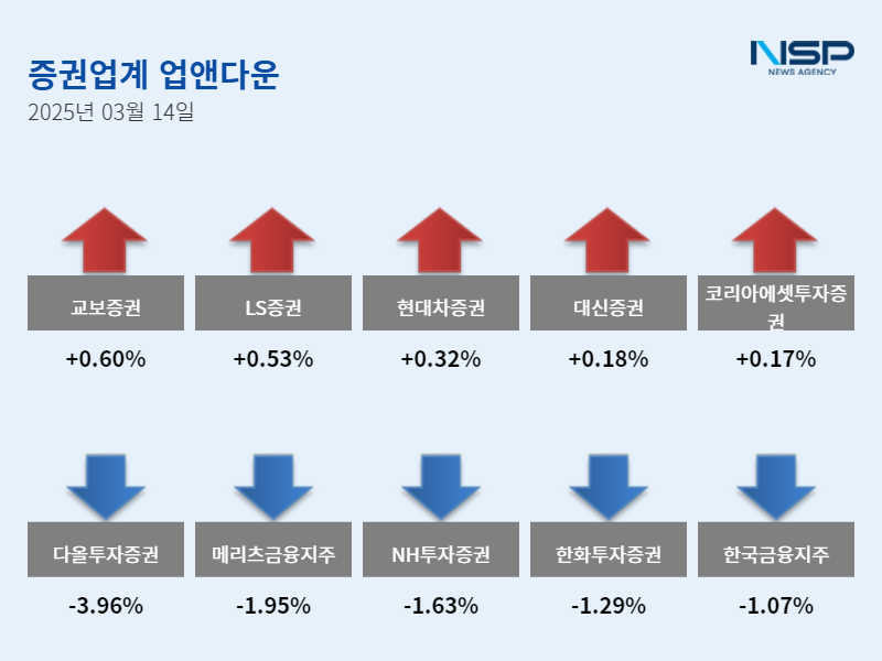 (서울=NSP통신) 설희 기자 = 14일 코스피(-0.28%), 코스닥(+1.59%)은 엇갈렸다. 이 가운데 증권주는 전거래일 대비 1.28% 하락했다. 증권주는 38종목 가운데 상승 9개였고 보합 4개, 하락 25개였다.