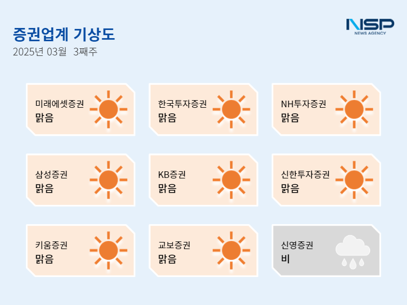 (서울=NSP통신) 설희 기자 = 2025년 3월 3주차 증권업계기상도는 미래에셋증권·한국투자증권·NH투자증권·삼성증권·KB증권·신한투자증권·키움증권·교보증권의 ‘맑음’, 신영증권의 ‘비’로 기록됐다.
