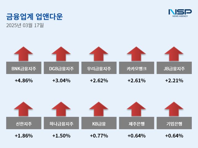 (서울=NSP통신) 강수인 기자 = 17일 코스피(+1.73%)와 코스닥(+1.26%)은 모두 상승했다. 이 가운데 은행주는 전거래일 대비 1.65% 상승했다. 은행주는 11종목 가운데 10종목이 상승, 1종목이 하락했다.