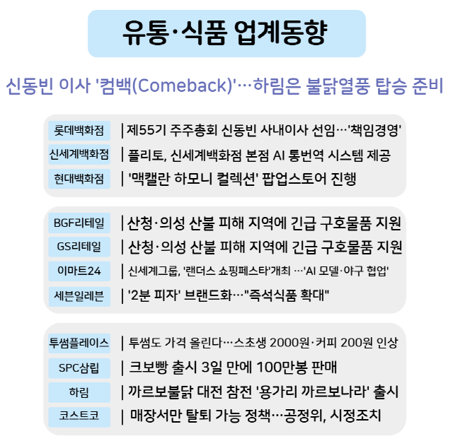 (서울=NSP통신) 옥한빈 기자 = 신동빈 롯데그룹 회장이 5년 만에 롯데쇼핑 사내이사에 복귀했다. 최근 롯데쇼핑의 실적악화에 따라 책임경영을 강화한다는 취지다. 신 회장은 지난 2019년 12월 롯데쇼핑 사내이사 임기 만료 3개월을 앞두고 사임한 바 있다. 롯데칠성 사내이사를 내려놓고 돌아온 만큼 롯데 백화점, 마트, 하이마트, 이커머스 등의 회사들의 변화가 주목해 볼만하다. 하림은 삼양식품의 불닭볶음면 대히트에 편승했다. 까르보 용가리불볶음면(컵)을 내놓으며 또다시 유사제품 논란이 일고 있지만 법적인 처벌은 어려운 실정이다. 불닭신제품 출시가 최근 매출액과 영업이익이 꾸준히 줄고 있는 중 돌파구가 될 수 있을지 관심을 끈다.