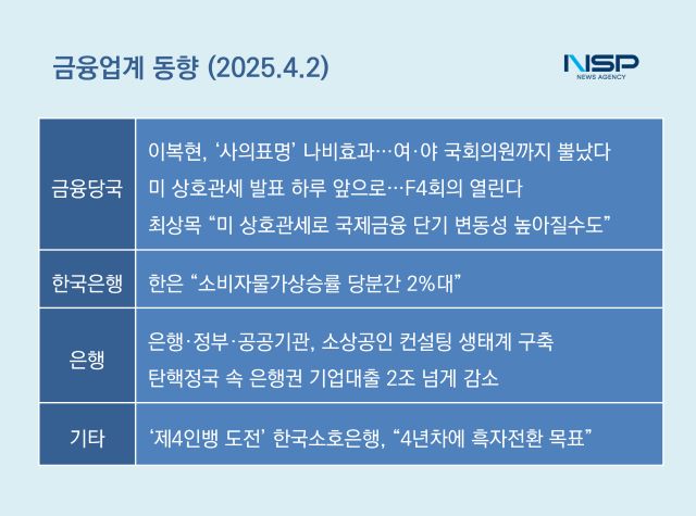 (서울=NSP통신) 강수인 기자 = 미국의 상호관세 발표가 하루 앞으로 다가온 가운데 금융당국 수장들 사이에서 긴장감이 돈다. 이복현 금융감독원장은 사의를 밝혔다가 당국 수장들의 만류에 일단 오는 3일 열릴 F4 회의에 참석하기로 했다. 불확실성이 커지자 기업들이 투자에 몸을 사리면서 은행권 기업대출은 큰 폭 쪼그라들었다.