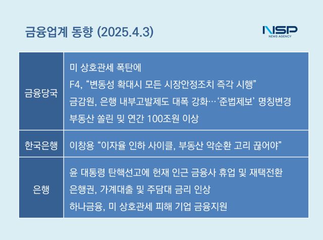 하나금융그룹은 미국의 상호관세 조치로 경영에 어려움이 예상되는 중소기업·소상공인을 위한 긴급 금융지원에 나섰다. 하나은행은 중소기업·소상고인의 긴급 유동성 지원을 위해 총 6조원 규모의 자금을 공급하기로 했다. 또 관세조치로 가장 큰 피해가 예상되는 자동차 부품업체의 운전자금 지원을 위해 신용보증기금과 240억원 규모의 신규 보증협약 체결할 예정이다. 소상공인을 위해서는 최대 1.9%의 우대금리가 적용되는 3000억원 규모의 신규자금이 지원될 예정이다.