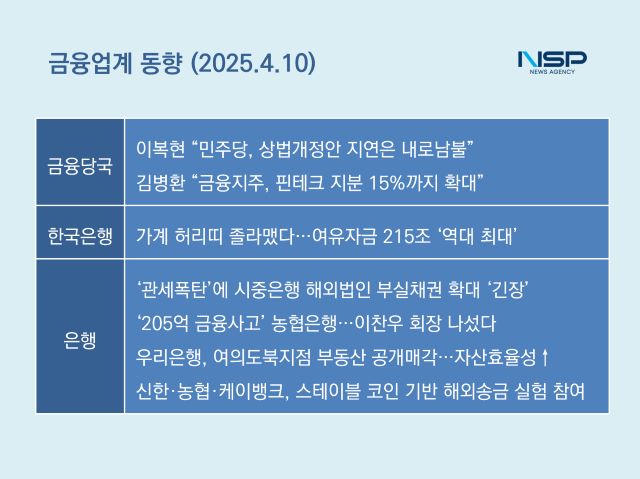 (서울=NSP통신) 강수인 기자 = 도널드 트럼프 미국 행정부의 상호관세가 중국을 제외하고 모든 국가들에 대해 90일 유예됐지만 금융시장의 불안감은 여전하다. 특히 동남아시아 법인을 가진 은행들이 긴장하는 분위기다. 한편 농협은행에서 발생한 거액의 부당대출 이슈들로 농협금융지주 회장이 임직원 메시지를 보내 내부통제 강화를 역설했다.