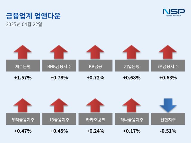 (서울=NSP통신) 강수인 기자 = 22일 코스피(-0.07%), 코스닥(+0.09%)은 상승과 하락이 엇갈렸다. 이 가운데 은행주는 전거래일 대비 0.30% 상승했다. 은행주는 11종목 가운데 9종목이 상승, 2종목이 하락했다.