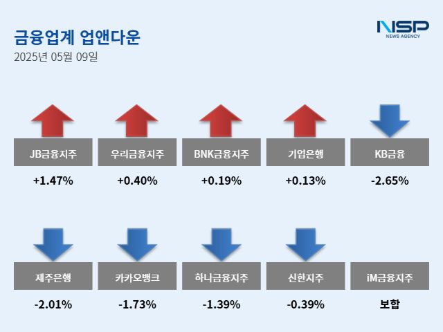 (서울=NSP통신) 강수인 기자 = 9일 코스피(-0.97%), 코스닥(+0.01%)은 하락과 상승이 엇갈렸다. 이 가운데 은행주는 전거래일 대비 1.11% 하락했다. 은행주는 11종목 가운데 4종목이 상승, 6종목이 하락했다. 보합세는 1종목이다.