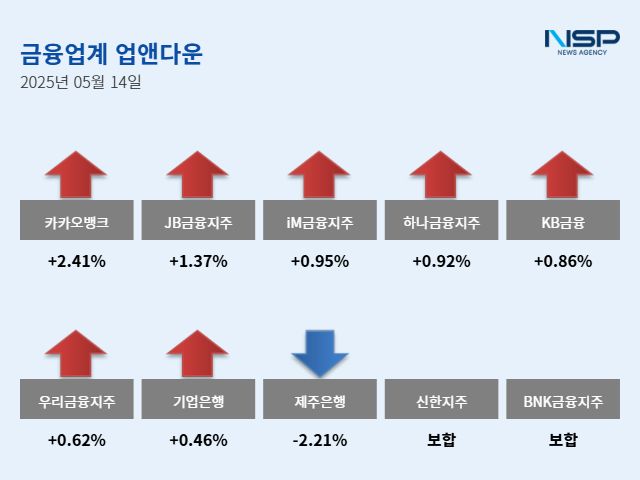 (서울=NSP통신) 강수인 기자 = 14일 코스피(+1.23%), 코스닥(+0.98%)은 모두 상승했다. 이 가운데 은행주는 전거래일 대비 0.75% 상승했다. 은행주는 11종목 가운데 7종목이 상승, 2종목이 하락했다. 보합세는 2종목이다.