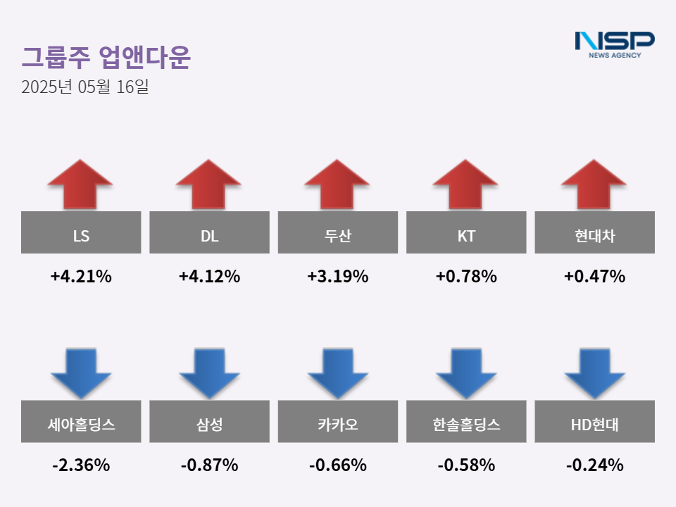 (서울=NSP통신) 최아랑 기자 = 16일 코스피(+0.21%)와 코스닥(-1.11%) 상반된 흐름을 보였다. 이 가운데 10대 그룹주도 등락했다. 가장 큰 변동을 보인 종목은 LS다. LS는 4.21%(6100원) 상승해 15만1000원으로 장을 마감했다.
