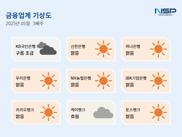 (서울=NSP통신) 강수인 기자 = 2025년 5월 3주차 금융업계기상도는 신한은행·하나은행·우리은행·NH농협은행·IBK기업은행·카카오뱅크·토스뱅크의 ‘맑음’, KB국민은행의 ‘구름조금’, 케이뱅크의 ‘흐림’으로 기록됐다.