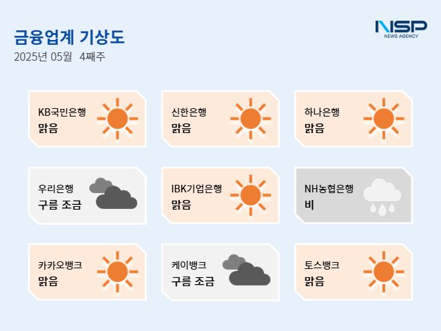 (서울=NSP통신) 강수인 기자 = 2025년 5월 4주차 금융업계기상도는 KB국민은행·신한은행·하나은행·IBK기업은행·카카오뱅크·토스뱅크의 ‘맑음’, 우리은행·케이뱅크의 ‘구름조금’, NH농협은행의 ‘비’로 기록됐다.