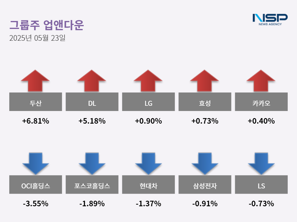 (서울=NSP통신) 최아랑 기자 = 23일 코스피(-0.06%)와 코스닥(-0.24%) 모두 하락했다. 이 가운데 10대 주가는 등락했다. 가장 큰 변동을 보인 종목은 두산이다. 두산은 6.81%(2만8000원) 상승해 43만9000원으로 장을 마감했다.