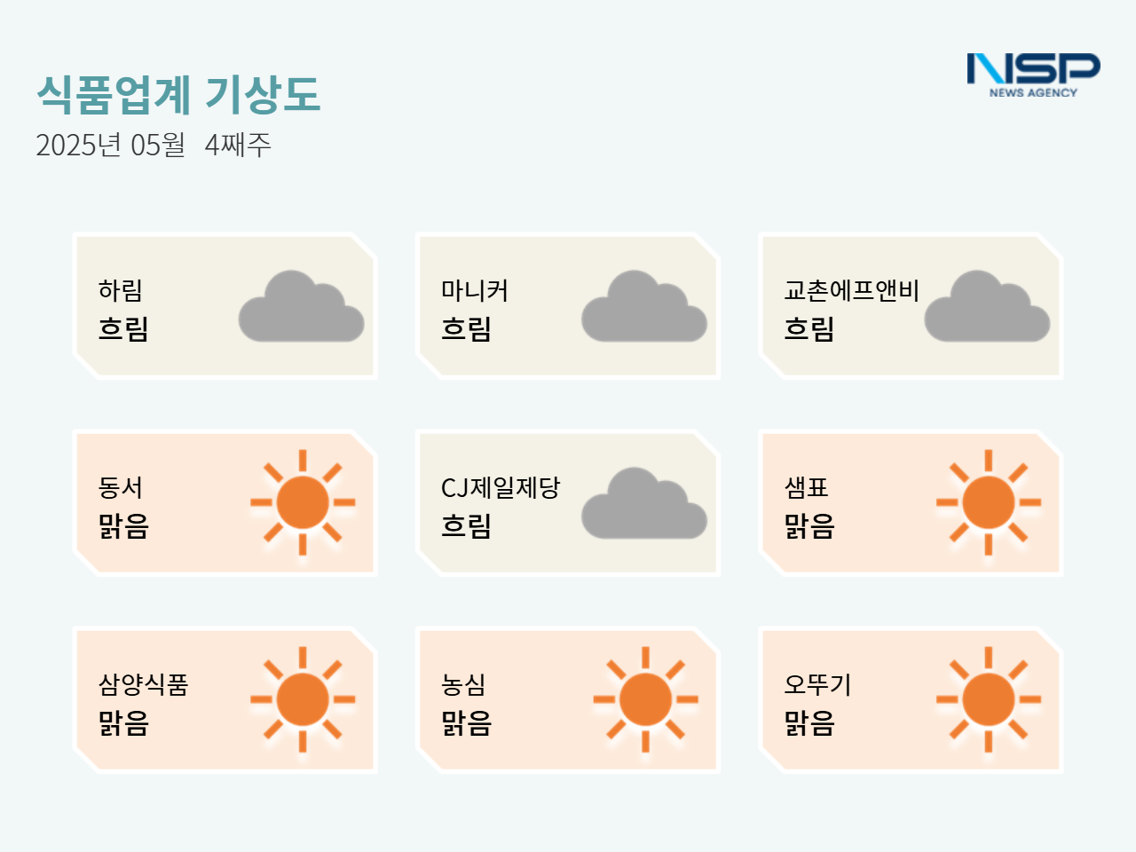(서울=NSP통신) 옥한빈 기자 = 2025년 5월 4주차 식품업계기상도는 동서, 샘표, 삼양식품, 농심, 오뚜기의 ‘맑음’, 하림, 마니커, 교촌에프앤비, CJ제일제당의 ‘흐림으로 기록됐다.