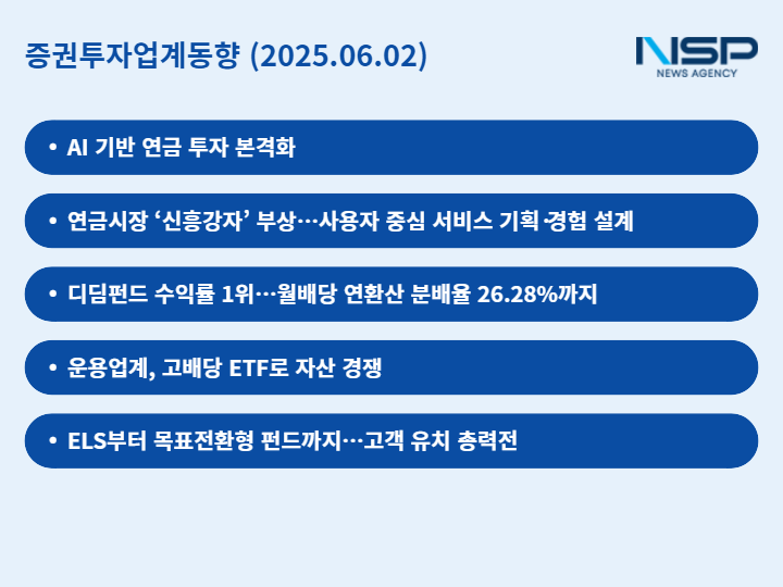 (서울=NSP통신) 설희 기자 = 자산운용 시장이 AI 기술과 배당 전략을 중심으로 빠르게 재편되고 있다. 퇴직연금 로보어드바이저, 월배당 ETF, 고배당 상품까지 고객 맞춤형, 현금흐름 중심의 운용이 두드러진다. 연금저축 시장에선 플랫폼 기반 서비스가 돌풍을 일으키고 상품 다변화를 통한 고객 유치 경쟁도 본격화됐다.