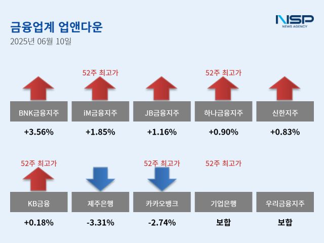 (서울=NSP통신) 강수인 기자 = 10일 코스피(+0.56%), 코스닥(+0.91%)은 모두 상승했다. 이 가운데 은행주는 전거래일 대비 0.24% 상승했다. 은행주는 11종목 가운데 6종목이 상승, 3종목이 하락했다. 보합세는 2종목이다.