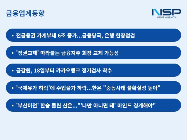 (서울=NSP통신) 강수인 기자 = 전금융권 가계대출이 총 6조원 증가하면서 가파른 상승세를 보이자 금융당국이 은행 현장점검에 나선다. 한편 정권 교체와 함께 임기 만료가 임박한 금융지주 수장 교체 가능성이 거론된다.