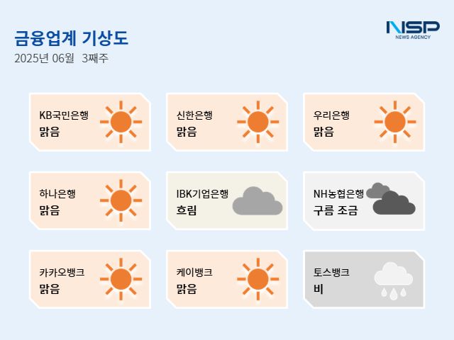 (서울=NSP통신) 강수인 기자 = 2025년 6월 3주차 금융업계 기상도는 KB국민은행·신한은행·우리은행·하나은행·카카오뱅크·케이뱅크의 ‘맑음’, NH농협은행의 ‘구름조금’, IBK기업은행 ‘흐림’, 토스뱅크 ‘비’로 기록됐다.