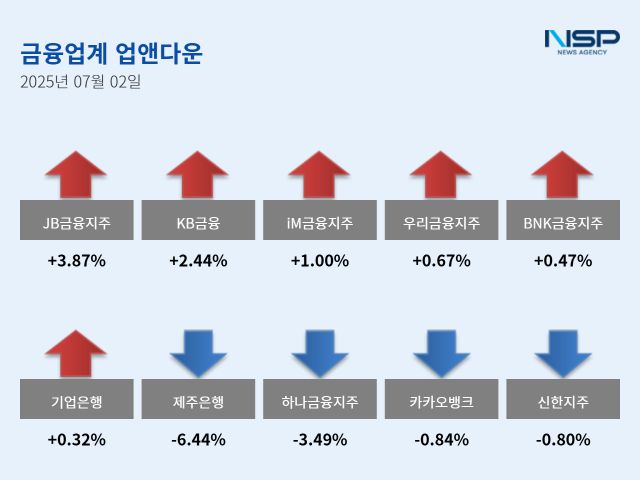(서울=NSP통신) 강수인 기자 = 2일 코스피(-0.47%), 코스닥(-0.19%)은 모두 하락했다. 이 가운데 은행주는 전거래일 대비 0.11% 상승했다. 은행주는 10종목 가운데 6종목이 상승, 4종목이 하락했다.