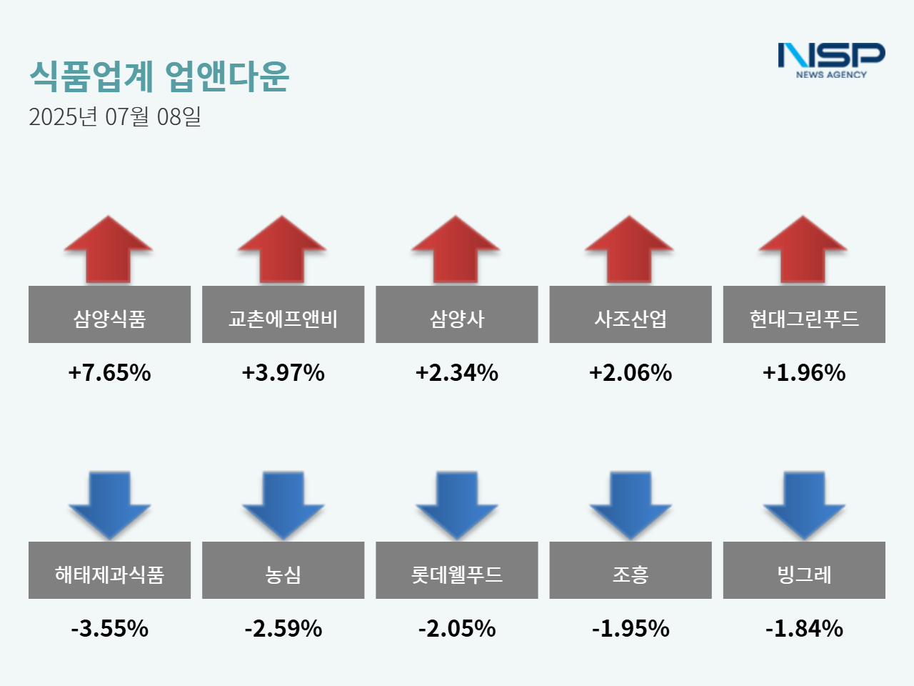 (서울=NSP통신) 옥한빈 기자 = 8일 코스피(+1.81%)와 코스닥(+0.74%)은 모두 상승했다. 이 가운데 식품주는 전거래일 대비 1.98% 상승했다. 식품주는 91종목 가운데 59종목이 상승, 24종목이 하락했다. 보합세는 8종목이다.