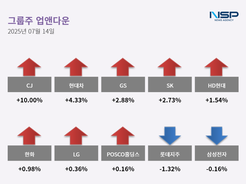 (서울=NSP통신) 최아랑 기자 = 14일 코스피(+0.83%), 코스닥(-0.14%)은 엇갈린 흐름을 보였다. 이날 가장 큰 변동을 보인 종목은 CJ였다. CJ는 10.00%(1만5900원) 오른 17만4900원에 거래를 마쳤다.
