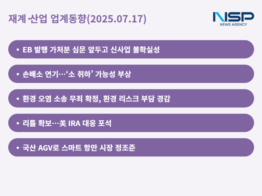 (서울=NSP통신) 최아랑 기자 = 국내 주요 기업들 중 태광산업의 대규모 신사업 투자 자금 조달이 법적 분쟁에 막히면서 미래 전략에 빨간불이 켜졌다. 한화오션은 하청노조 손해배상 소송 변론이 연기되고 노사 간 단체협약 체결로 화해 기류가 감지되지만 여전히 난관 속 난국 타개를 모색 중이다. 이와 함께 SK온과 현대로템 등은 글로벌 공급망 확보와 스마트 항만 시장 진출에 박차를 가하며 산업계 경쟁 구도가 긴박하게 전개되고 있다.