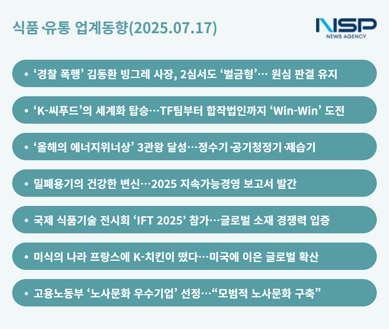 (서울=NSP통신) 옥한빈 기자 = 많은 이들의 주목을 받으며 선고된 빙그레 오너3세 김동환 사장의 경찰폭행(공무집행방해) 혐의는 원심과 같은 벌금형(500만원)으로 마무리 됐다. 아직 3심의 진행 방향이 미정인 상태이지만 한 숨 돌리게 됐다. 한편 오리온과 수협은 맞손을 잡고 ‘김’을 필두로 한 수산물 생산·가공·유통의 계획을 세웠다. 양 사는 합작법인을 설립해 공장설립까지고 계획 중인 것으로 알려졌다. 이 외에도 코웨이·락앤락의 사회적경영 성과 등이 이날의 이슈다.
