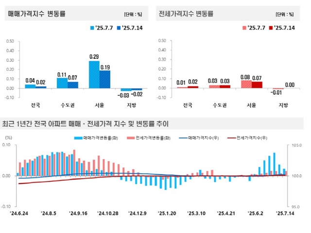 (서울=NSP통신) 강은태 기자 = 전국 주간 아파트가격은 7월 둘째주 매매가격은 0.02% 상승, 전세가격은 0.02% 상승을 기록했다.