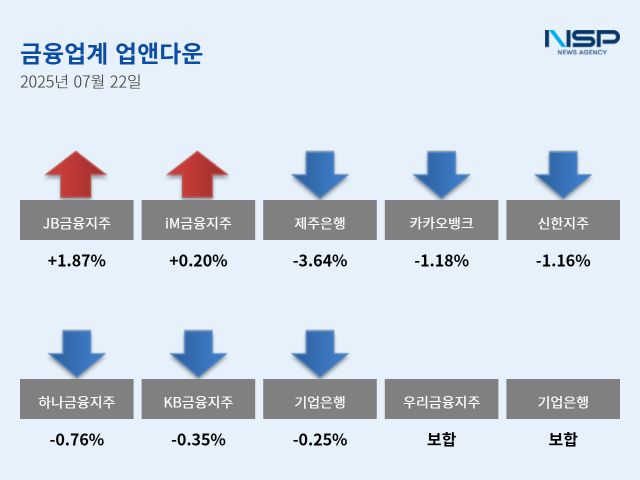 (서울=NSP통신) 강수인 기자 = 22일 코스피(-1.27%), 코스닥(-1.06%)은 모두 하락했다. 이 가운데 은행주는 전거래일 대비 0.53% 하락했다. 은행주는 10종목 가운데 2종목이 상승, 6종목이 하락했다.