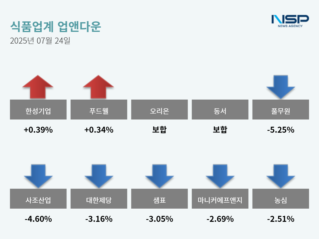 (서울=NSP통신) 옥한빈 기자 = 24일 코스피(+0.21%)는 상승, 코스닥(-0.45%)은 하락해 서로 엇갈린 양상을 보였다. 이 가운데 식품주는 전거래일 대비 1.28% 하락했다. 식품주는 91종목 가운데 11종목이 상승, 73종목이 하락했다. 보합세는 7종목이다.