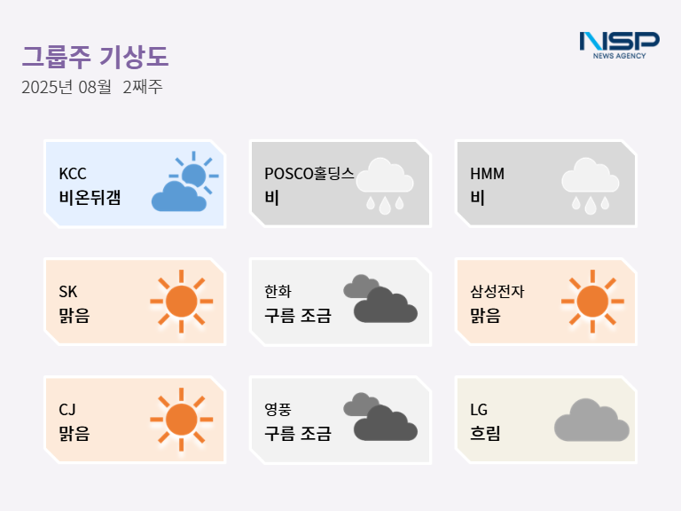 ◆한화(000880) ‘구름 조금’=한화는 시가총액 증가율 1위를 기록해 10대 그룹 중 가장 큰 상승세를 보였다. 한미 관세 협상 타결 기대감이 한화오션 주가를 밀어올려 200% 넘는 급등을 견인했다. 한편 한화가 인수한 급식업체 아워홈 전 대표 구본성 씨의 배임 혐의 재판과 관련해 한화 측이 제출한 처벌불원서가 논란이 되고 있다. 구 전 대표는 2017년부터 2021년까지 회삿돈 유용과 과다 성과급 수령 혐의로 기소돼 1심에서 징역 2년 집행유예 3년을 선고받고 22일 2심 판결이 예정돼 있다. 구지은 전 부회장은 한화 측 처벌불원서를 기업 윤리 부재로 비판하며 실형과 책임 범위에 사회적 관심이 쏠리고 있다.