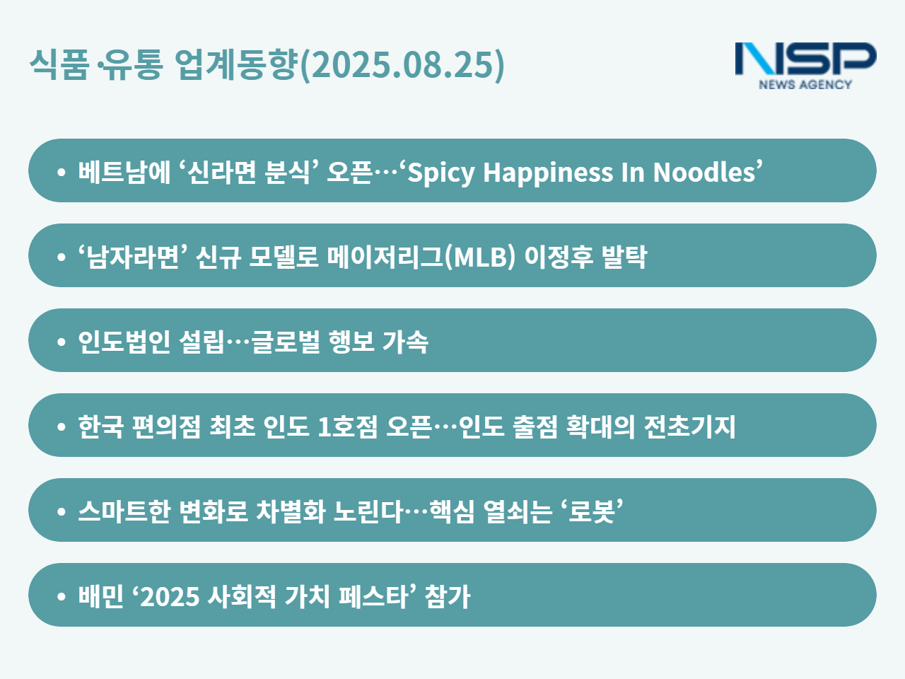 (서울=NSP통신) 옥한빈 기자 = 말도 많고 탈도 많던 기업과 노동계의 갈등이 일명 ‘노란봉투법’의 통과로 윤관이 잡히는 모양새다. 경제 6단체와 국민의힘은 지난 20일 ‘노조법 개정 반대 결의대회’를 개최하는 등 반대가 거셌지만 결국 통과됐다. 이에 진보당 계열과 노동계는 일제히 ‘환호’를 보내고 있다. 한편 업계의 글로벌 진출 및 확대는 더 이상 놀라운 일이 아니게 됐다. 편의점, 라면, 생활용품까지 다양한 전략을 뽐내며 도약을 준비하고 있다. 이 외에도 매드포갈릭의 안내로봇과 우아한형제들의 사화적가치 페스타 소식도 주목해 볼만하다.