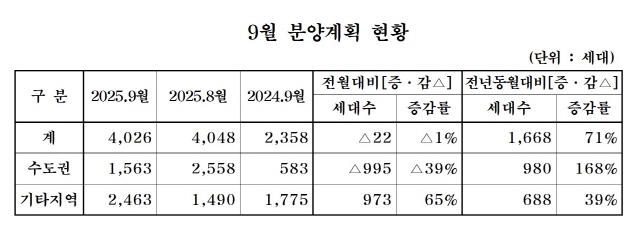 9월 주택분양, 9개 건설사 총 4026가구…전년동월比 71%↑