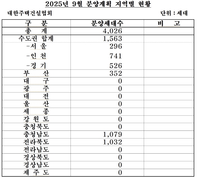 9월 분양계획 지역별 현황을 보면 수도권(1563가구)의 경우 서울 296가구, 인천 741가구, 경기가 526가구다. 부산은 352가구, 충청남도가 1079가구로 가장 많고 다음으로 전라북도 1032가구로 많다. 그 외 지역은 분양 예정이 없다.