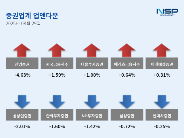 (서울=NSP통신) 임성수 기자 = 29일 코스피(-0.32%), 코스닥(-0.19%) 모두 하락한 가운데 증권주는 전 거래일 대비 +0.24%로 상승했다. 총 38종목 중 상승은 18, 보합 1, 하락 19개였다.