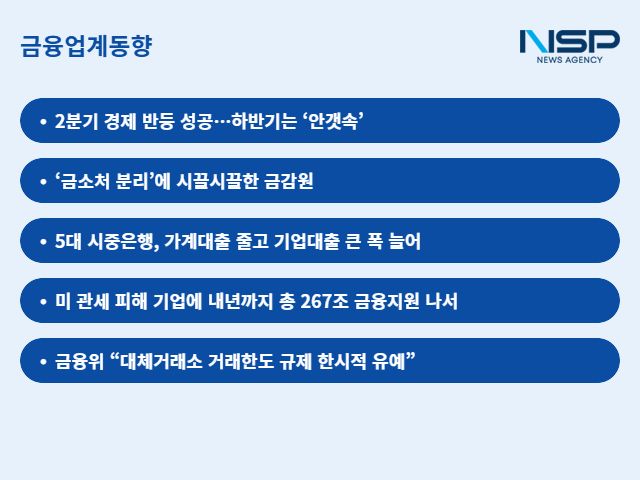 (서울=NSP통신) 강수인 기자 = 올 2분기 한국 경제가 반등에 성공했지만 여전히 미국의 관세 부과로 불안감이 감돈다. 자동차, 철강 등 품목 관세가 부과됨에 따라 수출에 직격타를 받을 것으로 전망된다. 한편 정부의 상생금융 압박으로 은행권의 기업대출 잔액이 대폭 증가했다.