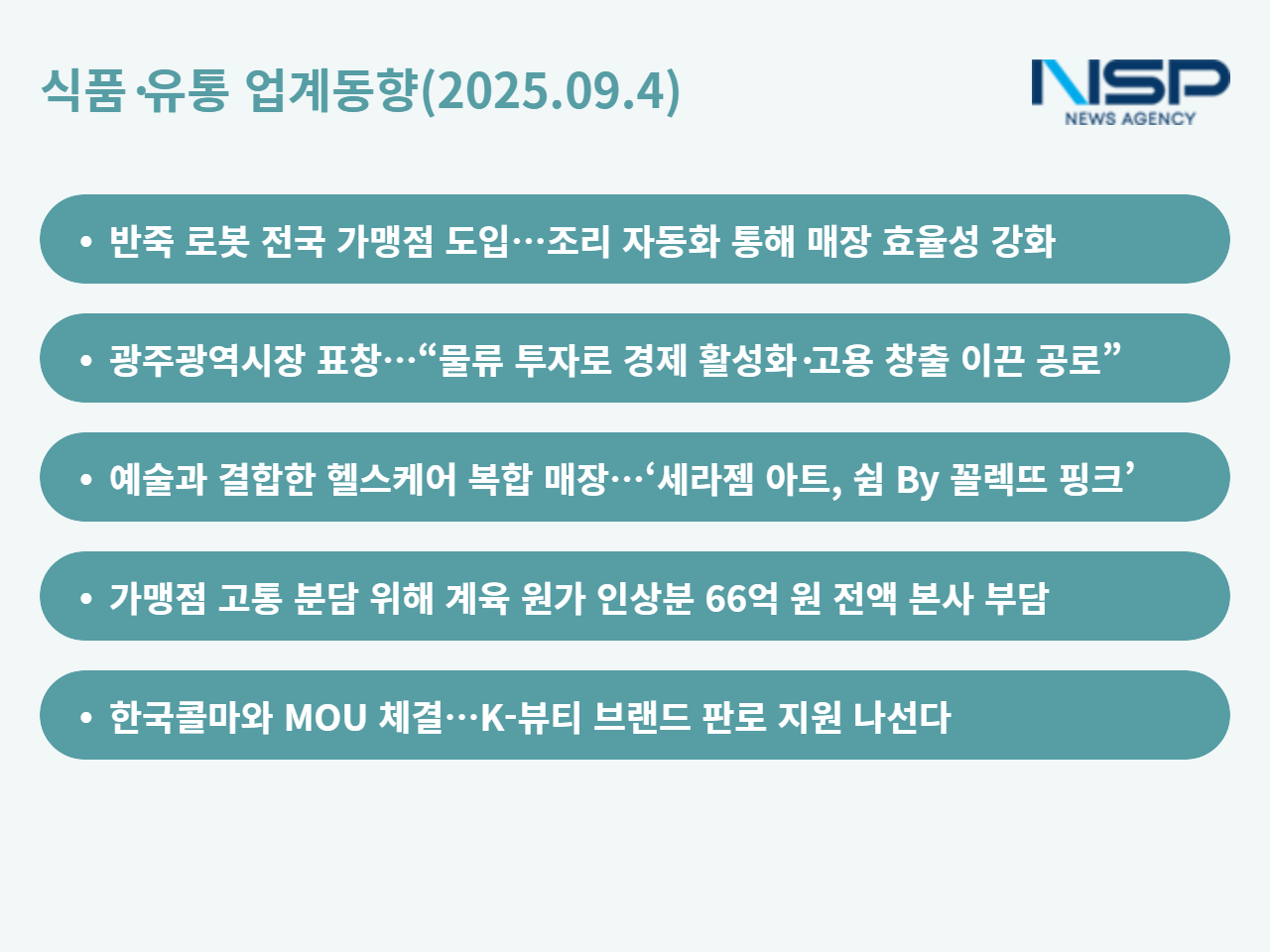 (서울=NSP통신) 옥한빈 기자 = 식품·유통 업계가 이번 주에는 기계와 예술, 그리고 상생이라는 키워드를 꺼내 들었다. 교촌은 반죽 로봇을 전국 가맹점에 투입하며 ‘조리 자동화 시대’를 본격화했고 쿠팡은 광주 지역 경제 활성화 공로로 시장 표창을 받으며 ‘고용 창출 기업’의 이미지를 굳혔다. 한편 세라젬은 헬스케어 매장을 예술 전시 공간으로 확장해 소비자 경험을 감각적으로 재해석했고 맘스터치는 계육 원가 상승분 66억 원을 본사가 전액 부담하며 가맹점과의 상생을 다시 한 번 강조했다. K-뷰티 판로 확대에도 불이 붙었다. 롯데면세점은 한국콜마와 손잡고 글로벌 시장을 겨냥한 협력을 강화하며 뷰티 브랜드 경쟁력 높이기에 나섰다.