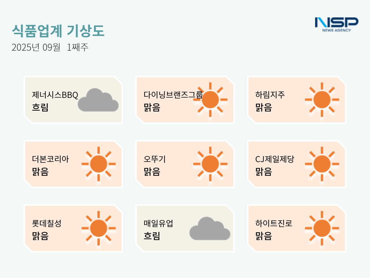(서울=NSP통신) 옥한빈 기자 = 치킨은 뜨겁지만 업계의 하늘은 맑고 흐림이 교차한다. 하림지주는 지역 축제와 제품 라인업으로 기세를 올리며 쾌청한 날씨를 맞았고, CJ제일제당과 오뚜기, 롯데칠성도 글로벌 시장과 신제품 성과로 구름 한 점 없는 청명세를 뽐냈다. 반면 제너시스BBQ는 30주년 기념행사와 해외 진출 호재에도 불구하고 식품위생법 위반 논란에 발목이 잡혀 잔뜩 흐린 표정이다. 매일유업 역시 추석 대목을 앞두고 분주했지만 ESG 성적표에서 꼴찌라는 뼈아픈 기록을 남겼다. 여기에 더본코리아와 하이트진로가 상생과 신제품으로 점주와 소비자 달래기에 나서면서 업계 전반은 희비가 엇갈렸다. 오늘의 업계기상도, 그늘진 곳도 있지만 대체로 ‘맑음’ 쪽에 손을 들어줄 만하다.