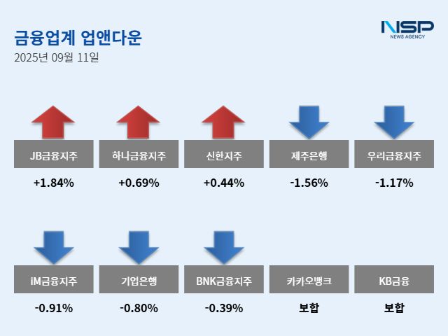 (서울=NSP통신) 강수인 기자 = 11일 코스피(+0.90%)와 코스닥(+0.21%)은 모두 상승한 가운데 은행주는 전거래일 대비 0.01% 상승했다. 은행주는 10종목 가운데 3종목이 상승, 5종목이 하락했다.