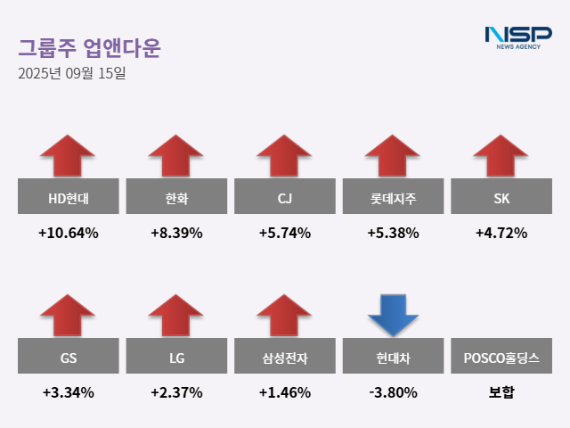 (서울=NSP통신) 최아랑 기자 = 15일 코스피(+0.35%), 코스닥(+0.66%)은 모두 상승했다. 이날 가장 큰 등락 변동을 보인 종목은 HD현대다. HD현대는 10.64%(1만5800원) 상승해 16만4300원으로 장을 마쳤다.