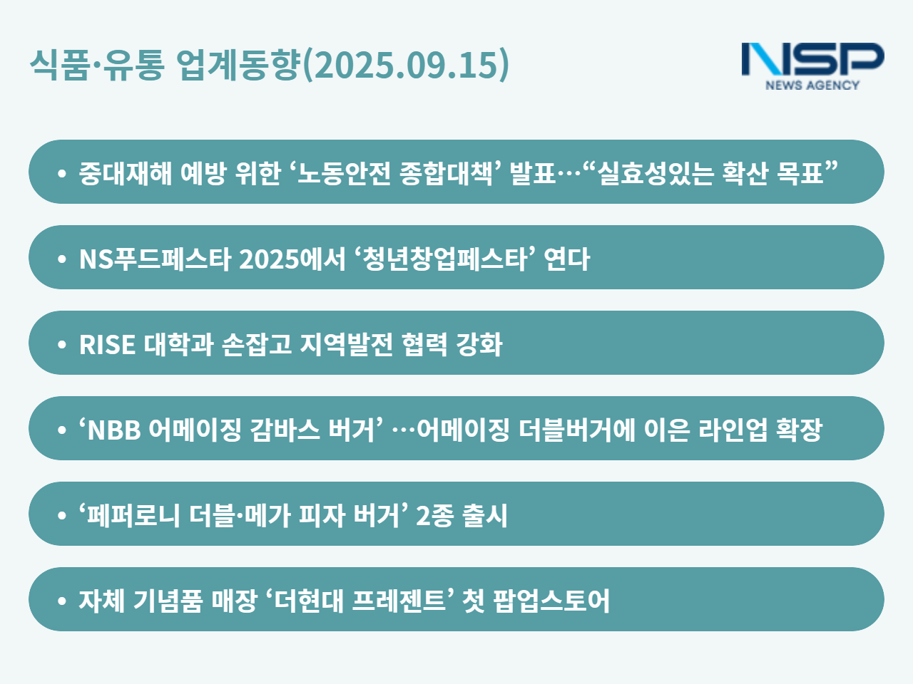 (서울=NSP통신) 옥한빈 기자 = 정부가 ‘노동안전 종합대책’을 내놓으며 산업현장의 안전을 다시 한번 화두로 올렸다. 취약 노동자 보호와 원청 책임 강화, 제도적 뒷받침이 ‘실효성’이 중요하다는 내용이다. 이에 경제계와 산업계는 긴장하며 본인들에게 내려질 제도적 제안을 기다리게 됐다. 한편 NS홈쇼핑은 푸드페스타 무대를 ‘청년창업페스타’로 확장하며 지역 청년에게 판로와 기회를 열었고, 소상공인시장진흥공단도 RISE 대학과 손잡아 청년 인재를 키우는 지역 혁신 실험에 나섰다. 산업과 유통이 ‘청년’에 눈 돌리는 사이 외식업계는 치열한 버거 전쟁에 돌입했다. 신세계 노브랜드 버거는 감바스를 버거로 재해석하며 ‘새우맛 한 방’을 꺼내 들었고, 맥도날드는 페퍼로니 피자 버거로 “패티는 많을수록 좋다”는 공식을 밀어붙였다. 여기에 현대백화점은 기념품 시장에까지 손을 뻗으며 자체 굿즈 경쟁력을 시험대에 올렸다.