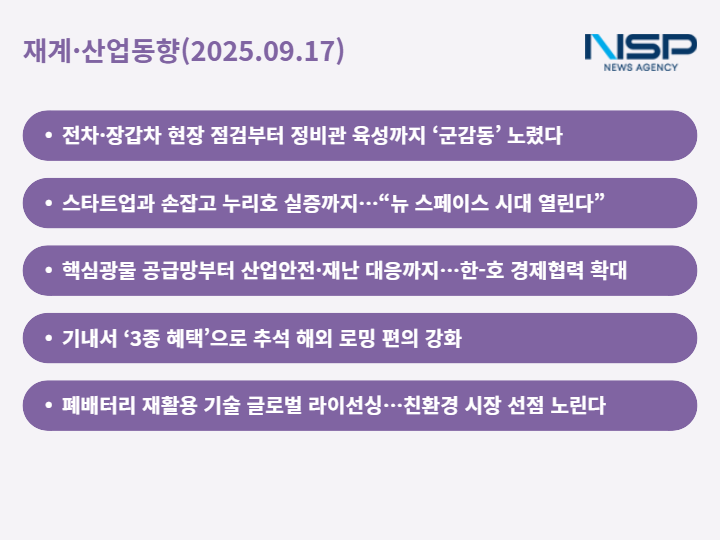 (서울=NSP통신) 최아랑 기자 = 국내 주요 기업들이 첨단 기술 도입과 전략적 투자, 사회적 책임 활동을 통해 경쟁력 강화와 미래 성장 동력 확보에 속도를 내고 있다. 현대로템은 육군 야전부대 지원, LG는 스타트업과 우주산업 실증, SK이노베이션은 배터리 재활용 기술 글로벌 확산을 각각 추진하고 있다.