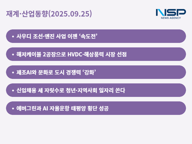(서울=NSP통신) 최아랑 기자 = 국내 주요 기업들이 미래 성장과 경쟁력 확보를 위해 발 빠르게 움직이고 있다. HD현대는 사우디 조선·엔진 사업 협력, 대한전선은 HVDC 해저케이블 생산 역량 강화, SK는 울산 제조AI와 문화도시 구축 전략으로 속도를 내고 있다.