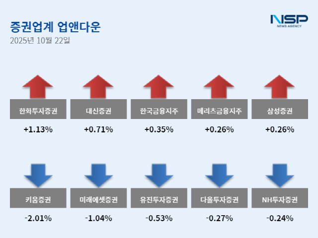 (서울=NSP통신) 임성수 기자 = 22일 코스피(+1.56%) 상승, 코스닥(+0.76%)도 상승했다. 증권주는 전 거래일 대비 0.28% 하락했다. 증권주 38종목 가운데 상승은 13개, 보합 3개, 하락 22개다.