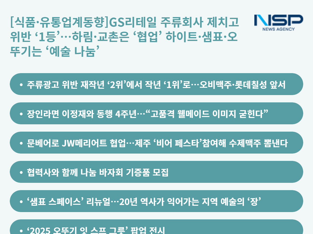(서울=NSP통신) 옥한빈 기자 = 국내 식품·유통업계가 이번 주엔 ‘술 냄새’와 ‘사람 냄새’가 교차했다. GS리테일은 주류 제조사들을 제치고 주류광고 ‘위반’ 1위에 올라 ‘저력’을 입증했고 하림과 교촌은 각각 배우·호텔과 손잡고 브랜드 협업의 확장을 이어갔다. 한편 하이트진로·샘표·오뚜기는 예술과 나눔으로 산업의 온도를 높이며 사회공헌과 문화적 감성을 앞세운 이색 행보를 펼쳤다. 특히 샘표는 공장 안에 갤러리를 다시 열고 오뚜기는 ‘스프 그릇’을 주제로 팝업 전시를 열어 기업이미지를 되새긴다.