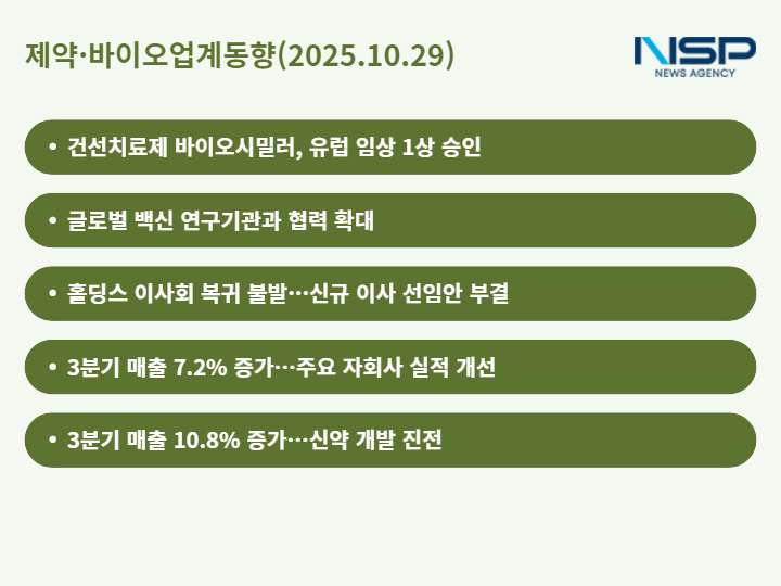 (서울=NSP통신) 정송이 기자 = 제약·바이오업계에서 바이오시밀러(바이오의약품 복제약) 임상 승인과 글로벌 협력 확대 소식이 전해졌다. 일부 기업은 지배구조 이슈로 이사 선임이 무산됐으며 3분기 실적 개선을 기록한 기업들도 나타났다.