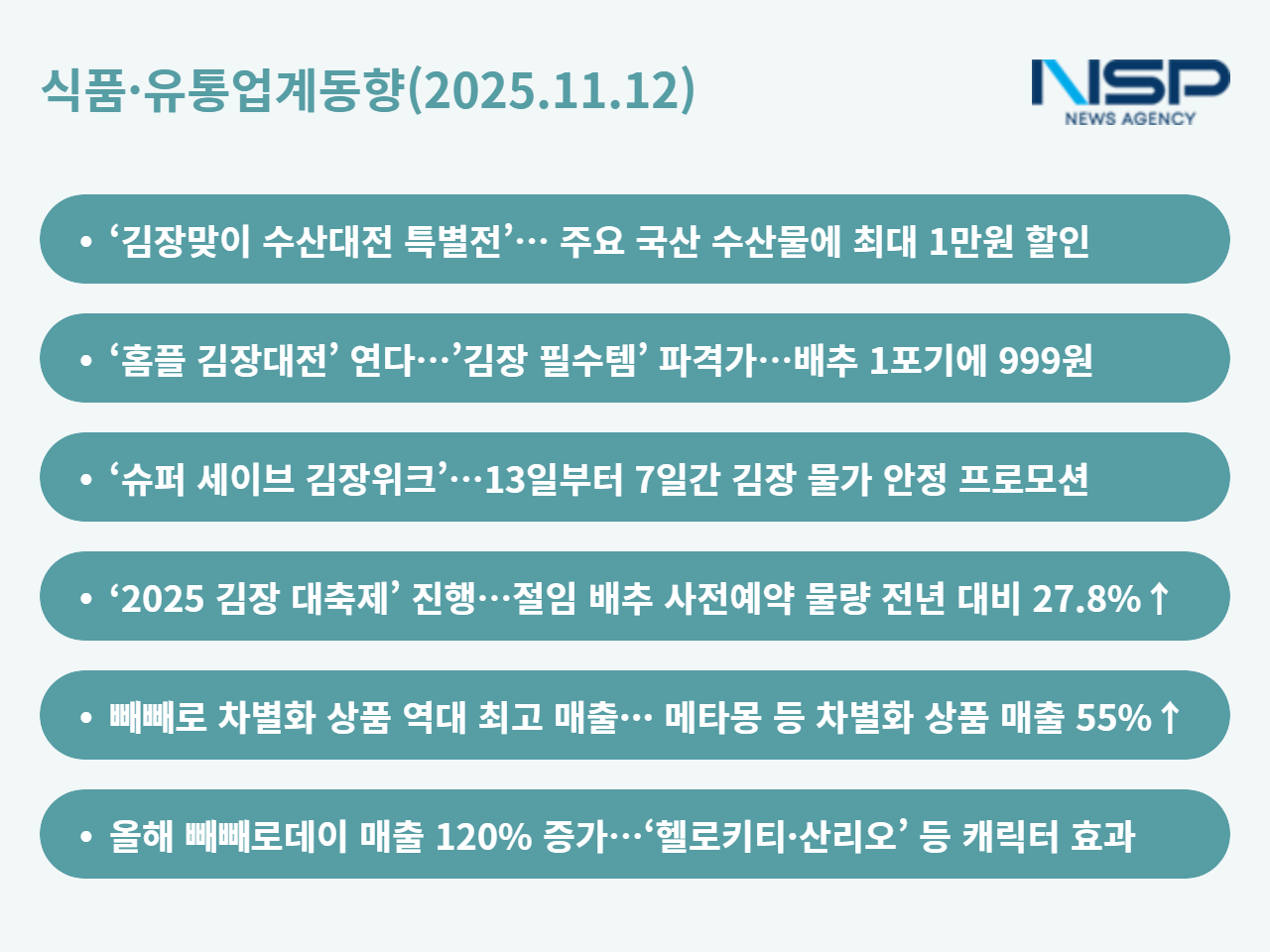 (서울=NSP통신) 옥한빈 기자 = 김장철을 앞둔 유통가가 다시 ‘배추 모드’에 돌입했다. 오아시스마켓은 수산물로 김장 밑국물부터 챙기고, 홈플러스는 “배추 한 포기 999원”이라는 승부수를 던졌다. 롯데마트와 슈퍼는 ‘김장위크’를 선언하며 물가 안정의 민간 선봉을 자처했고, GS더프레시는 절임배추 예약만으로도 전년 대비 27.8% 성장하며 ‘김장 체감경기’ 호조를 보여줬다. 한편 김치 담그는 냄새 사이로 달콤한 초콜릿 향도 진동했다. CU와 세븐일레븐은 빼빼로데이 매출이 각각 전년 대비 55%, 120% 뛰며 편의점가의 미소를 키웠다. 특히 ‘메타몽’과 ‘산리오’ 캐릭터가 MZ세대의 마음을 단번에 훔치며 과자가 아닌 ‘캐릭터·굿즈’가 주인공이 된 셈이다. 이것도 하나의 소비트렌드가 되버린 상황에 편의점을 넘어 다양한 채널들에서도 반응을 이끌어 낼 수 있을지도 관심사다.