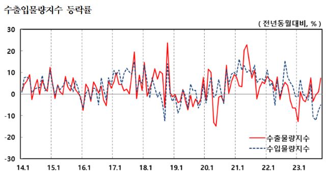 29일 한국은행이 발표한 ‘2023년 10월 무역지수 및 교역조건’에 따르면 지난달 수출물량지수는 전년 동월 대비 7.4% 상승했다. 섬유 및 가죽제품(-6.9%), 전기장비(0.1%) 등이 감소했지만 석탄 및 석유제품(28.6%), 컴퓨터·전자 및 광학기기(6.1%) 등이 증가해 상승세를 이끌었다.
