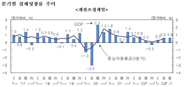 5일 한국은행이 발표한 ‘2023년 3분기 국민소득(잠정)’에 따르면 3분기 실질 국내총생산(GDP)은 전분기 대비 0.6% 성장했다. 속보치와 동일한 수치다.