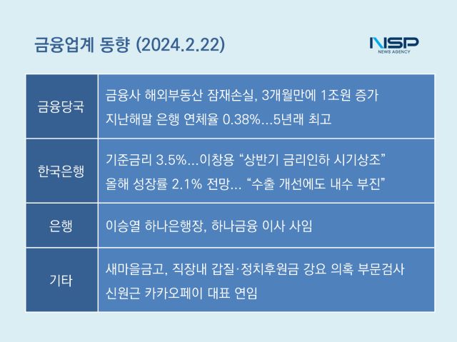 (서울=NSP통신) 강수인 기자 = 한국은행 금융통화위원회가 기준금리를 9회 연속 3.5%로 동결한 가운데 이창용 한은 총재는 상반기 금리 인하는 시기상조라고 선을 그었다. 한편 최근 임직원 윤리규범 지침을 마련한 새마을금고에서 또 직원 성추행 및 갑질 사건이 터져나왔다.