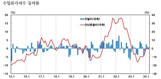 (서울=NSP통신) 강수인 기자 = 수입물가가 3개월 연속 상승세를 보이고 있다. 원·달러 환율은 하락했지만 국제유가가 오른 영향이다. 최근 미국의 조기 금리 인하 시점이 늦어진 점, 중동 상황이 불안해진 점 등으로 인해 환율과 유가가 더 오를 것으로 전망돼 물가 상승폭이 확대될 수 있다는 전망이 나온다.